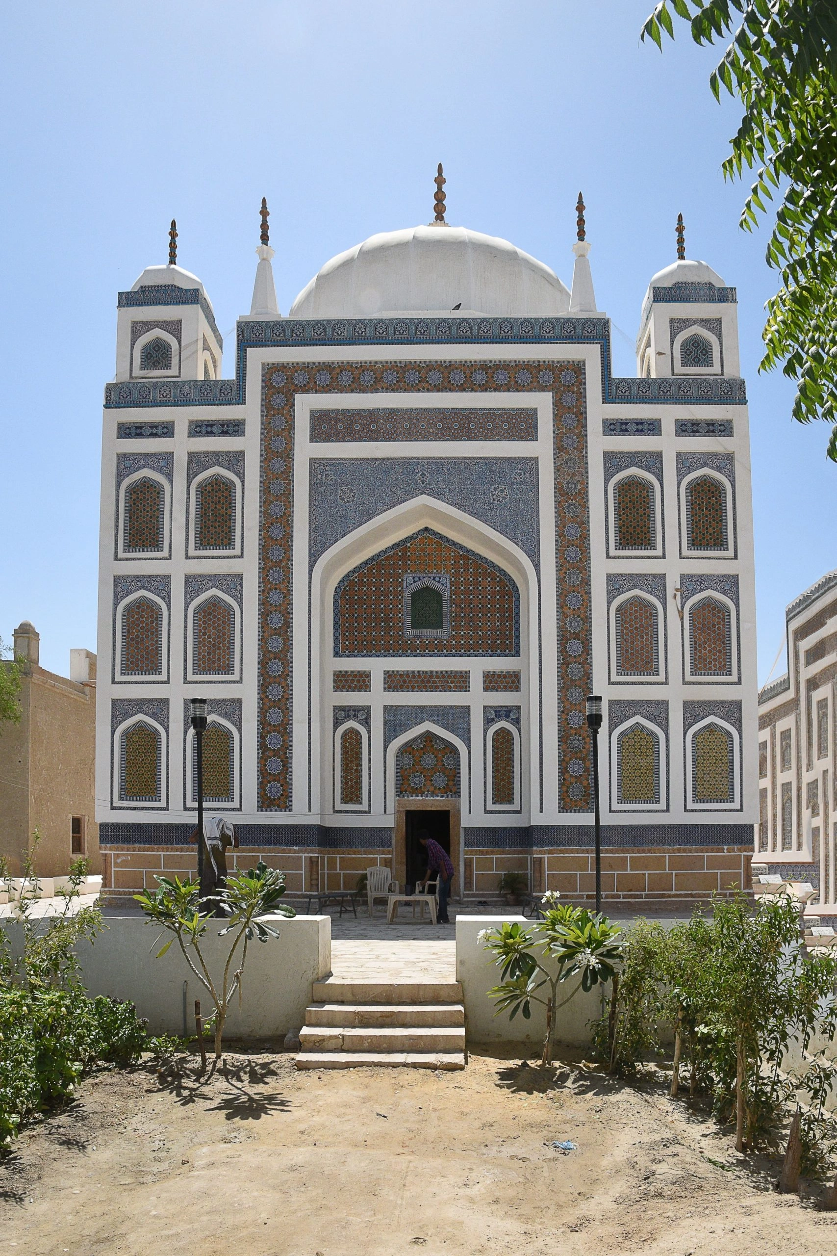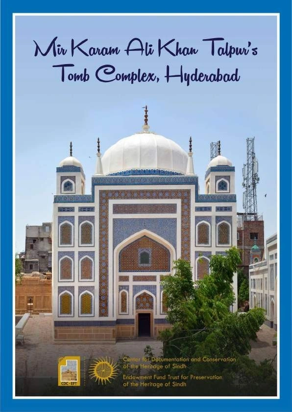 In the late 18th century Mir Fateh Ali Khan Talpur, the founder of the dynasty adopted a novel system of power sharing. Sindh was divided into three principal units: Hyderabad, Khairpur and Mirpurkhas. The Hyderabad branch adopted a system by which senior members of the family jointly ruled the region. Mir Fateh Ali Khan, along with his three brothers, Mir Ghulam Ali, Mir Karam Ali and Mir Murad Ali, became the Chauyars (four friends) and their government was known as Chauyari. With the death of Mir Ghulam Ali, Mir Karam Ali ascended the throne in 1812 C.E. Mir Karam Ali Khan Talpur was a poet and the Diwan i Karam is his well-known collection. He ruled for seventeen years and is the first Talpur ruler to be buried in Hyderabad in the precincts of the area referred to as the tombs of the Amirs of Sindh. The tomb is a square building crowned by a hemispherical dome with three tiered glazed finial resting on an inverted lotus base. At each corner, there is a kiosk, surmounted by a domelet with a miniature finial. Each side of the kiosk contains an arched paneling provided with glazed terracotta screens. The façade of the mausoleum has been constructed in such a way as to give an impression that the building has three storeys. This has been done by dividing each side of the façade into three ornamental storeys. Each containing recessed blind arches, one upon the other.
