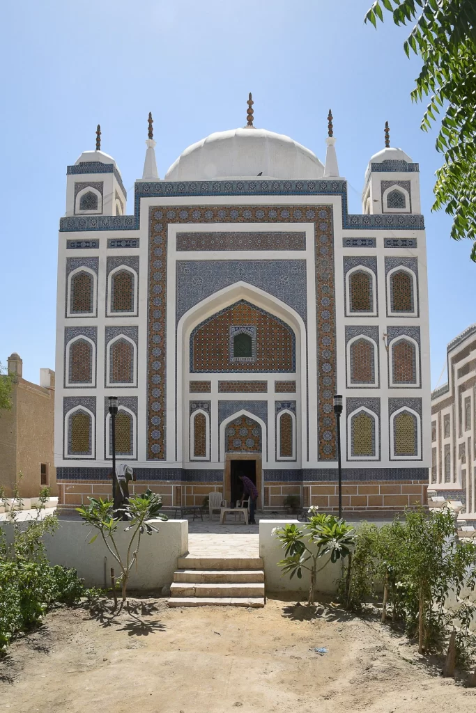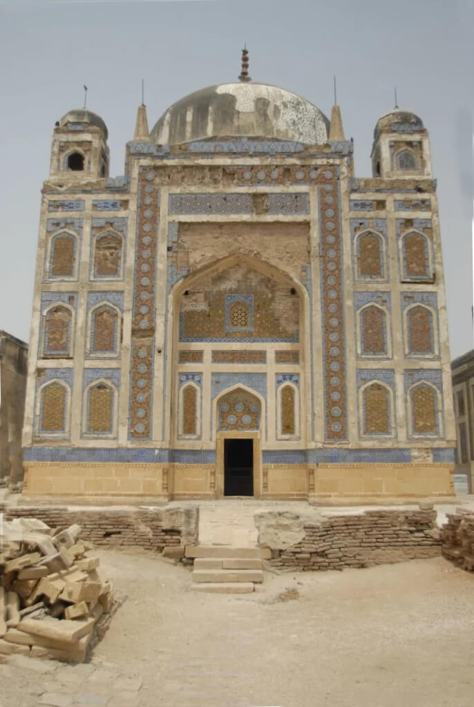 This innovation has got its roots in Taq i Kisra (Iran) from where it was adopted in the Alai Darwazah, Delhi. The tomb is covered on exterior with glazed terracotta tiles in different shapes and patterns. The interior is decorated with frescoes and glazed tiles. With the passage of time and intemperate weather conditions, vandalism and neglect, the entire complex is in a dilapidated condition particularly its kashi tile work has suffered and the tomb has lost its grace and architectural poise. Responding to a request for restoration of the structure, the Endowment Fund Trust for Preservation of the Heritage of Sindh on May 24, 2010, initiated work on the restoration of the tomb. Along with the Badshahi Bungalow, restoration work on the Mir Karam Ali Khan Talpur tomb is in full swing and near completion. Special care is being taken to retain the originality of the patterns and the durability of the tiles