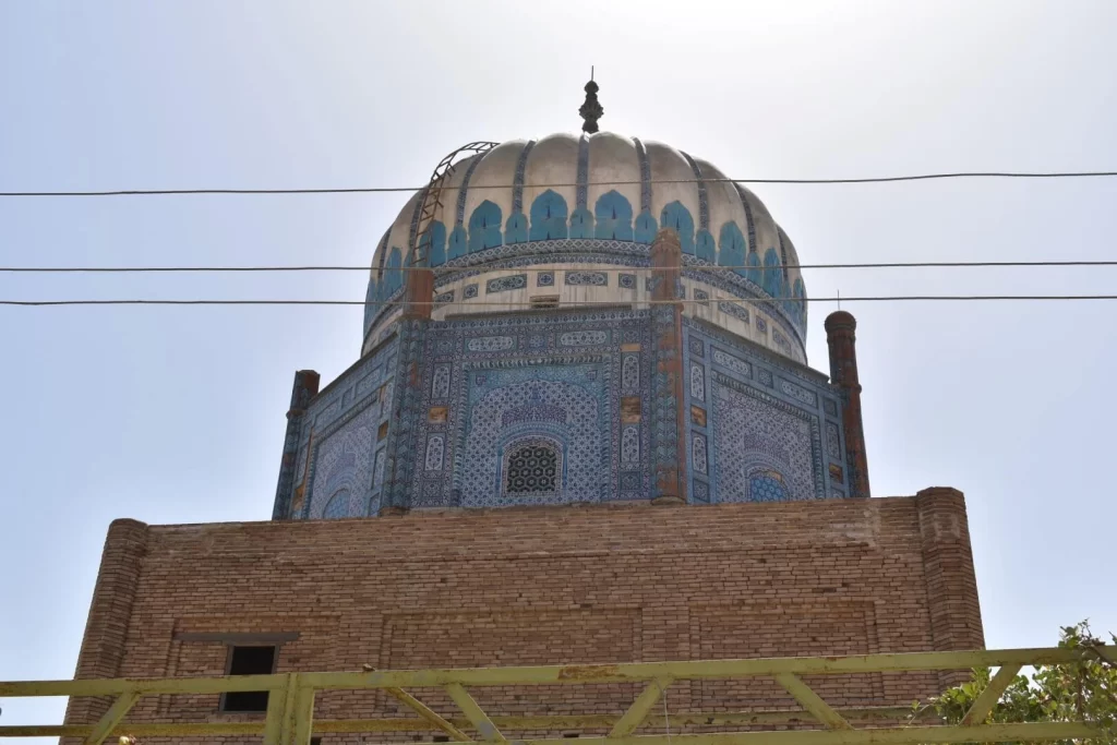 The tomb of Qutb-al-Aqtaab Hazrat Pir Agha Abdul Rahim Jan Mujaddidi Sarhandi was built in the late 19th century in the tradition of Multani architecture. The structure was constructed with clay bricks, and vertically divided in three portions: the base, the middle (octagonal prism) with eight turrets and four windows, and a circular dome with four lighting shafts. The entrance of the tomb is from the east, with two additional doors in the north and south. The eastern entrance has a main door with a bucket arch, and two smaller doors with rowlock arches.