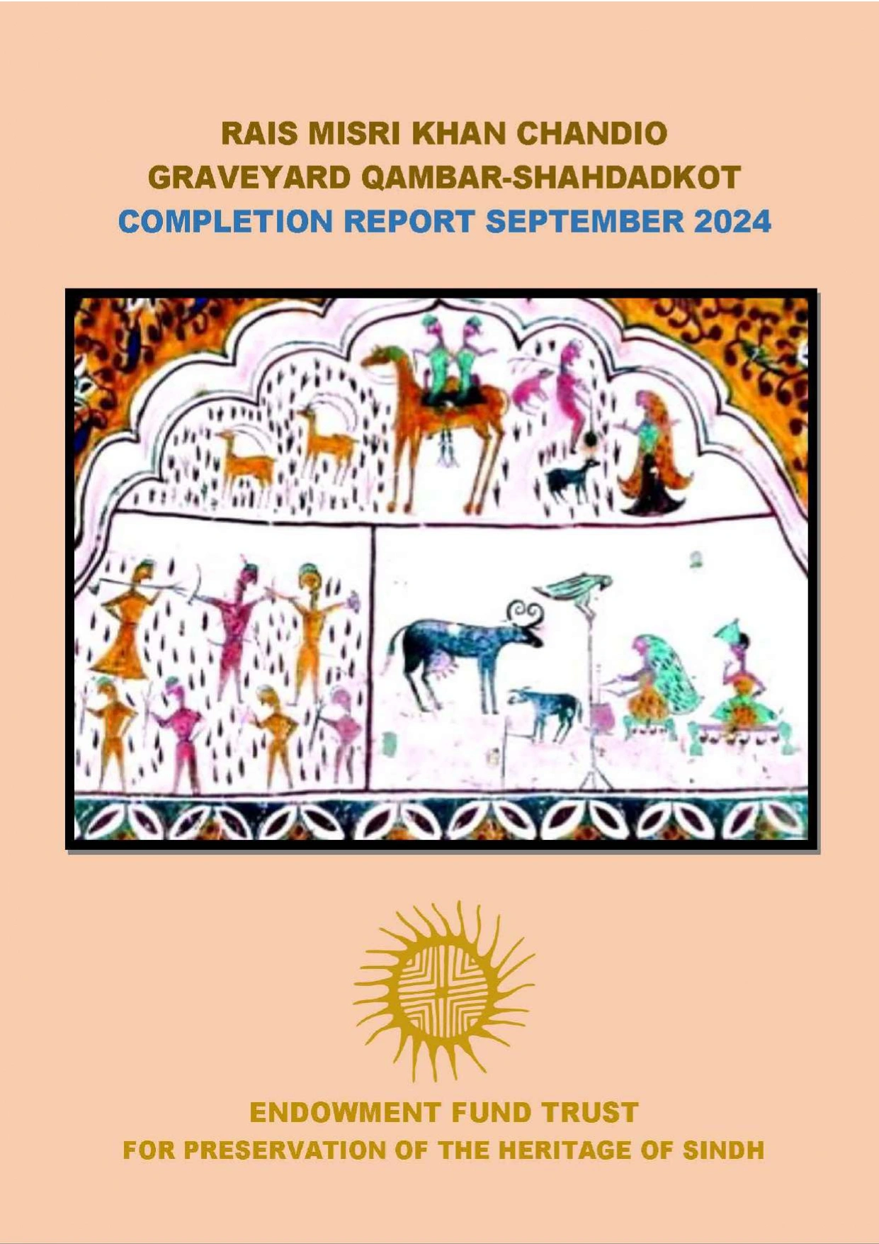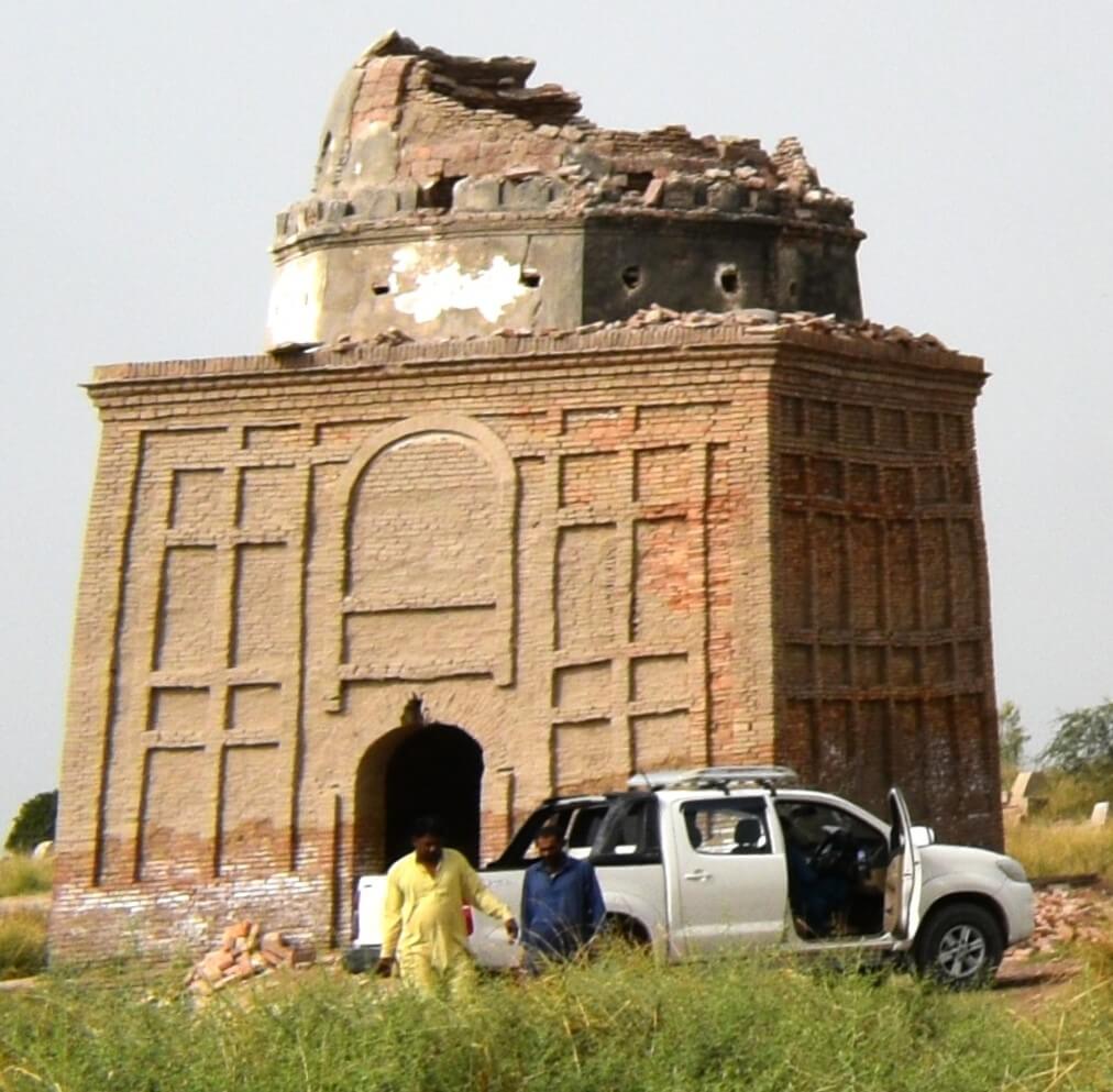 There are a large number of historic monuments in Sindh which needs to be protected and preserved. In Miro Khan Taluka in Qamber- Shahdadkot district, there are some impressive funerary monuments of the Kalhora (1700-1783) and Talpur (1783-1843) periods which are noted for mural paintings. In the last two decades these funerary monuments have been fast decaying and it is feared that if timely restoration is not taken, these historic tombs will crumble. One of the most neglected and crumbling tombs belong to the Husnani Chandia caste at Rais Bambho Khan and Aitbar Khan Villages. There are many prominent cemeteries in Kambar- Shahdadkot which belong to the nobles of the Chandia tribe. These include the Rankun, Husnani graveyards near Gebi Dero, Rais Aitbhar Khan and Rais Bambho Khan Necropolises. Amongst all these, the tombs at Rais Bambho Khan Village are in a deplorable condition. These tombs are located about 6 km south of Miro Khan in the village of Rais Bambho Khan. There are five tombs built in the 18th and 19th centuries. Buried in these tombs are Ghazi Khan Husnani Chandio, Misri Khan Husnani Chnadio, Mir Muhammad Husnani Chandio, Lashkari Khan Husnani Chandio, Lahno Khan Husnani Chandio and Tharo Khan Husnani Chandio of whom, sprang Manani, Misrani Lashkrani and Tharani sub- clans respectively. The tomb of Ghazi Khan is in shambles. Much of its plaster has peeled off. It faces an eastern direction and is crowned with a hemispherical dome. The tomb has been badly damaged due to the vagaries of weather and a lack of proper maintenance by the descendants. Furthermore, it is a victim of encroachment wrought by the local people that they have started to till the land near the structure. To the south of the tomb of Ghazi Khan is a tomb of Misri Khan who was an ancestor of the Misrani lineage of the Husnani Chandias. This tomb is also in a bad state of preservation. Close by the tomb of the Misri Khan is the tomb of Mir Muhammad alias Mano. Mir Muhammad Khan was an ancestor of the Manani clan who are living in both Rais Bambho Khan Village in Miro Khan taluka and Aitbar Khan Chandio village in Shadadkot Taluka. The tomb of Mir Muhammad is comparatively in a good state of preservation than that of Ghazi Khan and Misri Khan. The tomb contains four graves including that of Mir Muhammad. The other three graves are not identified since none bears an epigraph. The tomb is entirely decorated with paintings and separate panels that were created to depict folk romances and rural glimpses of everyday life.