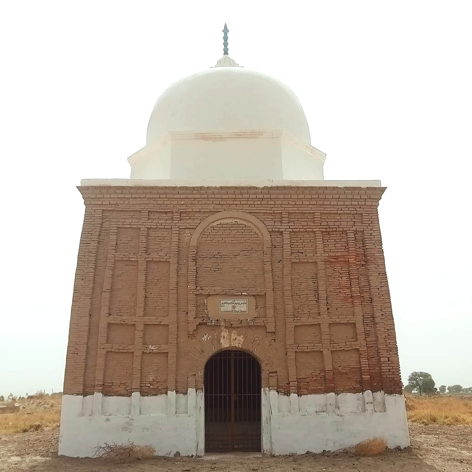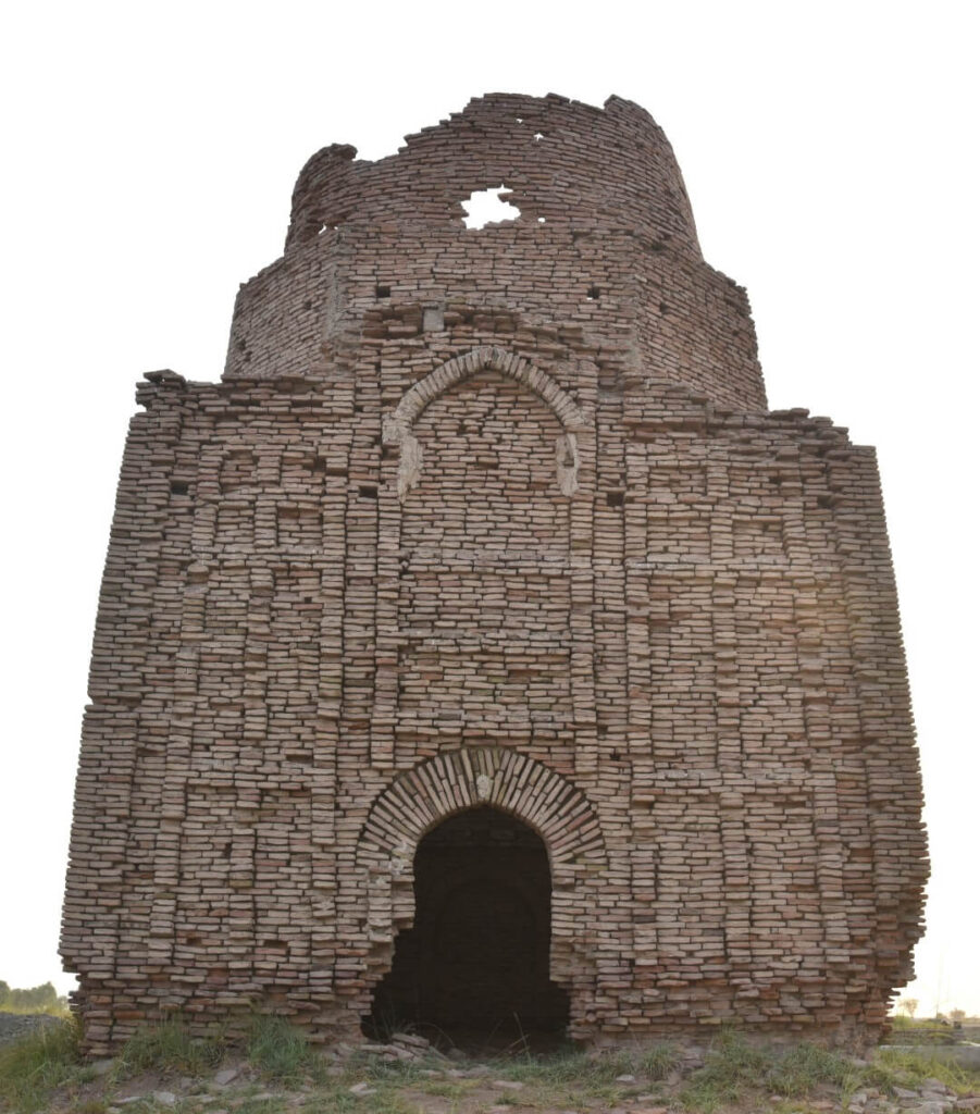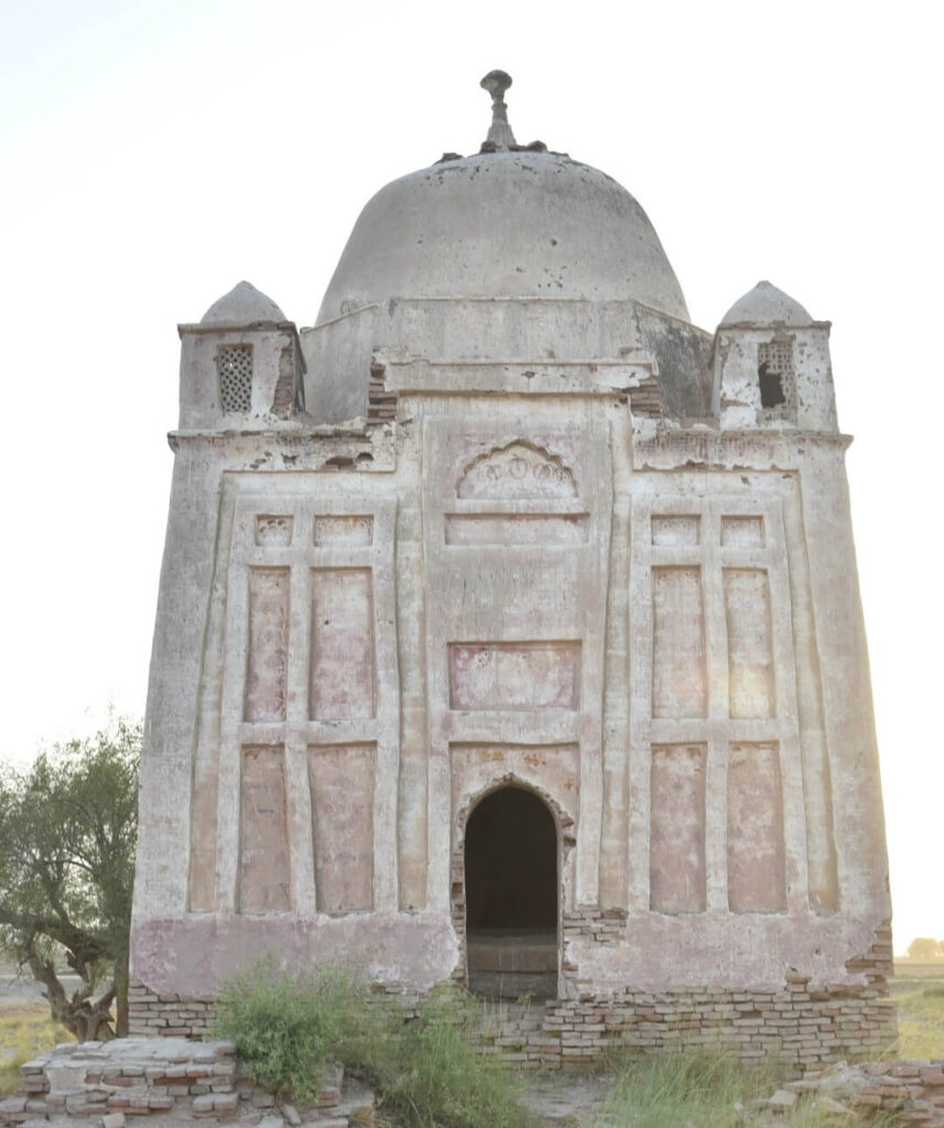 The Tomb of Bhambo Khan, is square in shape, measuring 21′-6″ X 21′-6″ (exterior) and rectangular in shape in its interior side 15′-7.0” X 15′-4.0”. The total covered area measuring 462.25 Sq.ft. The exterior height of the tomb is 16′-9”. The tomb is constructed with burnt bricks (8.75” x 6.5” x 1.75”) and (8.5” x 6.75” x 1.5”), mud,chiroli,lime with traditional lime plaster. The façade has the entrance on the eastern side, which has a recessed Tudor arch way occupying nearly the total height of the structure up- to the parapet. Within this Roman arched recess is the doorway which is the main entrance to the tomb ornamented with rectangular panels. On both sides of the recessed arched entrance are blind vertical rows of rectangular panels (four in each row). The remaining three sides of the tomb have five rows of rectangular vertical panels (six in row). The dome is constructed with burnt bricks with chiroli and lime plaster on it. It is Provincial style dome in shape.