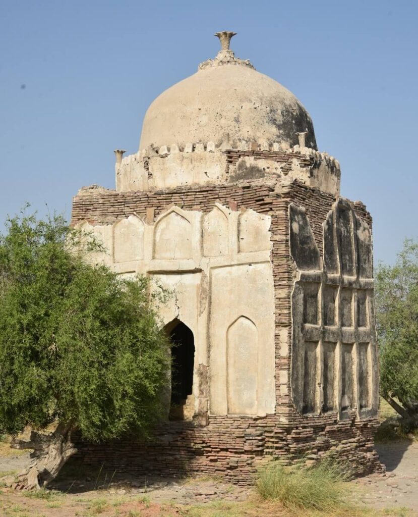 The Tomb of Ghazi Khan is rectangular in shape, measuring 21′-8″ X 21′-5″ (exterior) and rectangular in shape in its interior side 15′-0.0” X 15′-6.0”. The total covered area measures 463.7406 Sq.ft. The exterior height of the tomb is 19′-3”. The tomb is constructed with burnt bricks (10” x 6.5” x 2”), mud,chiroli,lime with traditional lime plaster.