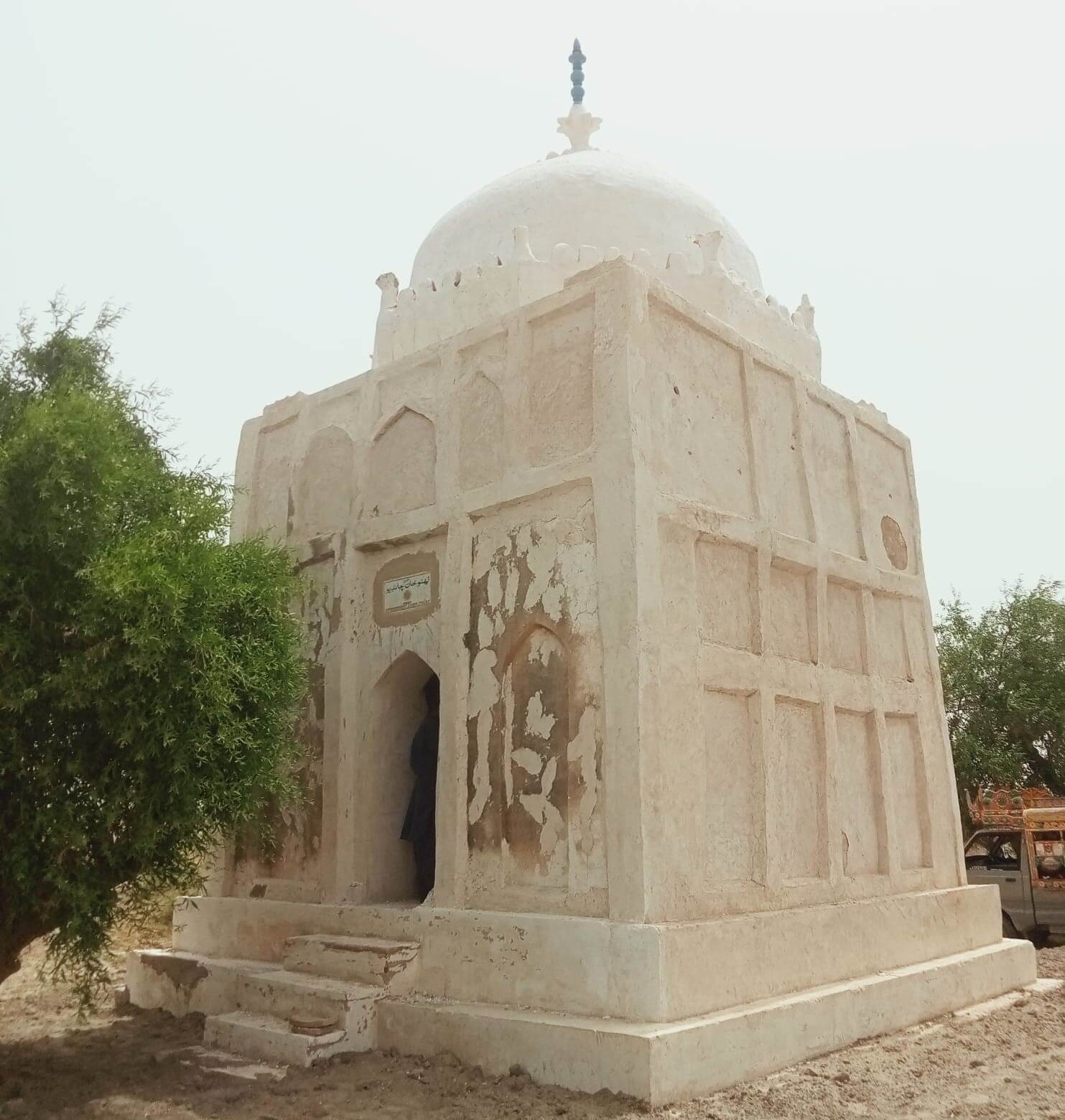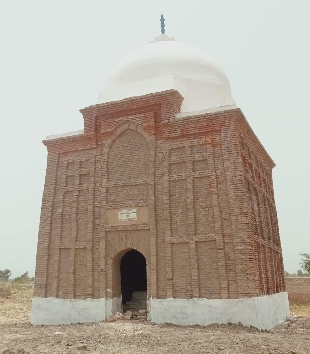 The Tomb of Ghazi Khan is rectangular in shape, measuring 16′-0″ X 16′-6″ (exterior) and square in shape in its interior side 11′-4.0” X 11′-4.0”. The base of the tomb is 17′-8” x 18′-2”.The total covered area measures 264 Sq.ft. The exterior height of the tomb is 17′-9”. The tomb is constructed with burnt bricks (9” x 6” x 1.5”), mud,chiroli,lime with traditional lime plaster. The façade has the entrance on the eastern side, which has a recessed rectangular arch way occupying nearly the height of the structure with panel decorated with Tudor arch row above the recessed arch on facade. Within this Tudor arched recess is the doorway which is the main entrance to the tomb. On both sides of the recessed arched entrance are blind vertical rows of Tudor arch panels (one on each side). The remaining three sides of the tomb have three rows of rectangular vertical panels (four in row). The exterior sides of the tomb plastered with lime. The dome is rests on the octagonal drum, constructed with burnt bricks with chiroli and lime plaster on it.