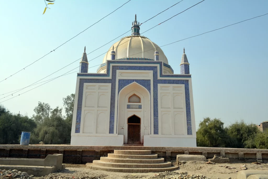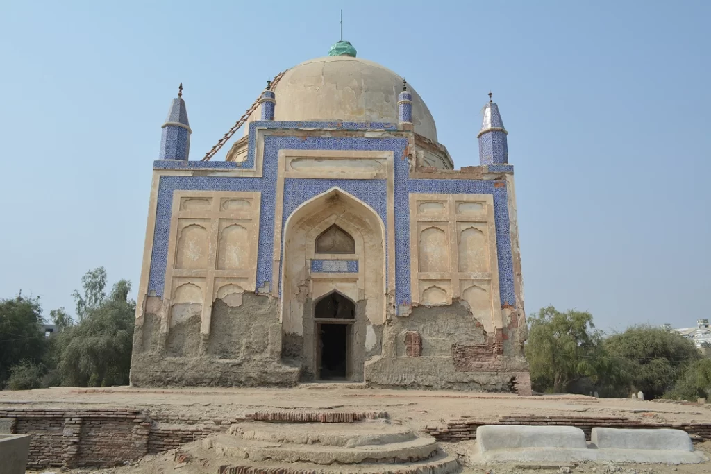 Demand from the civil society of Larkana, published in Dawn Newspaper on 8 March 2013, for repairs and restoration of the tomb motivated EFT to share responsibility of researching, documenting and restoring the tomb. Work commenced in August 2015. A detailed documentation report was prepared, which included architectural drawings, an assessment and fabrication of traditional materials used in the building, and a comprehensive inventory of the kashi tiles used on the tomb. After the lantern and finials were restored to their original form, the dome was re-plastered and strengthened with dome ribs. Damaged or missing brick masonry on the exterior was replaced with new burnt bricks, followed by lime and chiroli plaster that was fabricated in purpose-built lime tanks on-site. Interior work included re-plastering the walls and niches, repairing the dilapidated gravestones, and relaying the brick flooring. The external platform was also restored with steps leading up to the tomb. The work was carried out over a period of three years, and completed in January 2019.